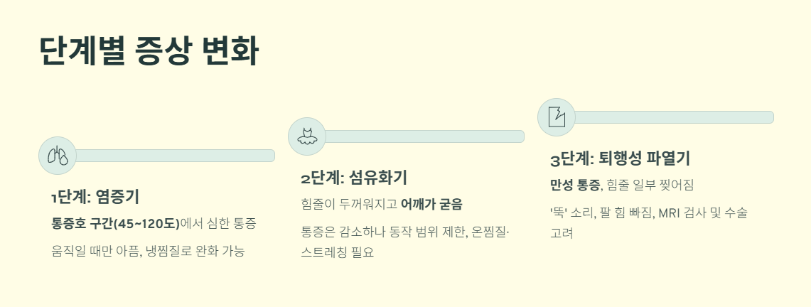 통증이 다소 줄어든 듯 보이지만, 팔을 들거나 뒤로 젖히는 동작이 점점 제한됩니다.