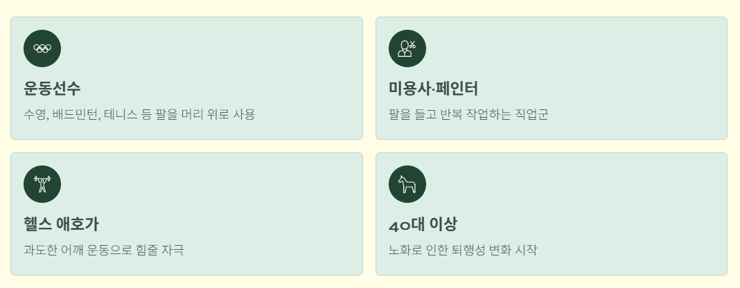 이 질환은 운동선수, 미용사, 페인터, 헬스족 등 팔을 머리 위로 자주 쓰는 사람에게 많으며, 40대 이후에는 노화로 인한 퇴행성 변화로 쉽게 발생합니다.