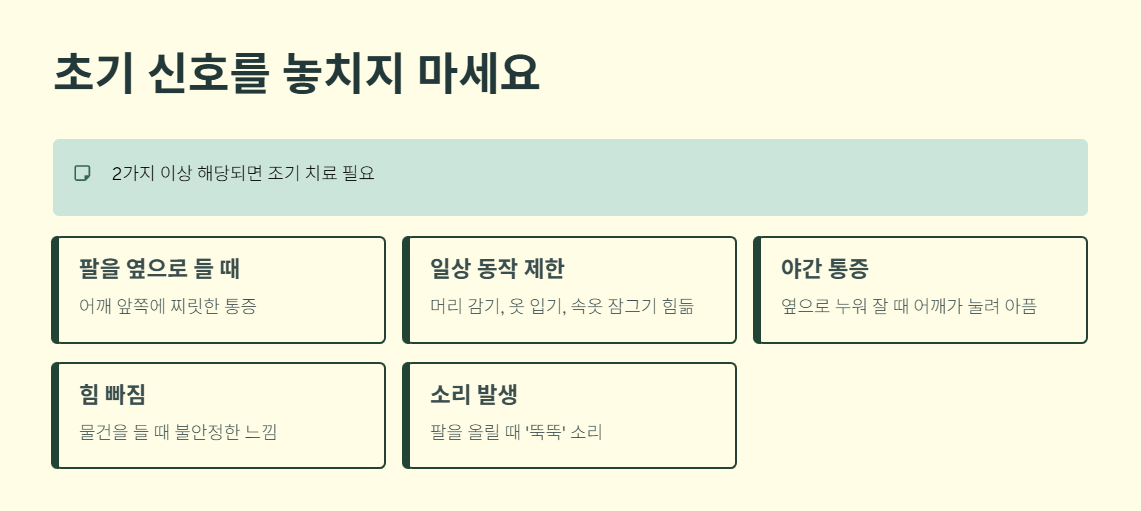 - 팔을 옆으로 들 때 어깨 앞쪽에 찌릿한 통증이 느껴진다.