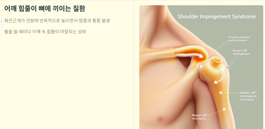 쉽게 말해, 팔을 들 때마다 어깨 속의 힘줄이 뼈에 끼이거나 마찰되는 상태입니다.