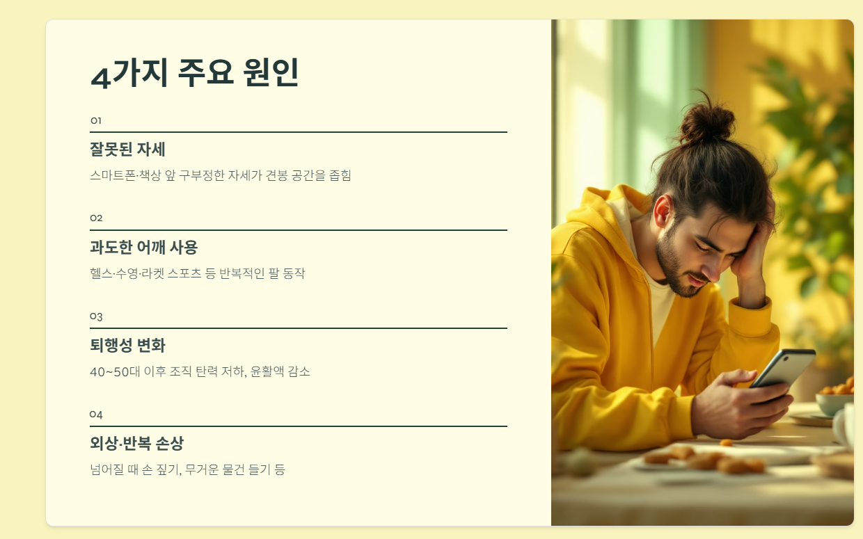 어깨충돌증후군은 ‘어깨 힘줄이 반복적으로 뼈에 부딪히는 질환’으로, 초기엔 단순 통증이지만