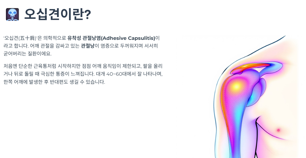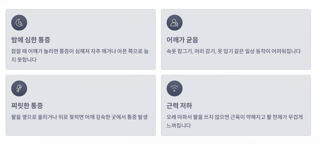 처음엔 단순한 근육통처럼 시작하지만 점점 어깨 움직임이 제한되고,