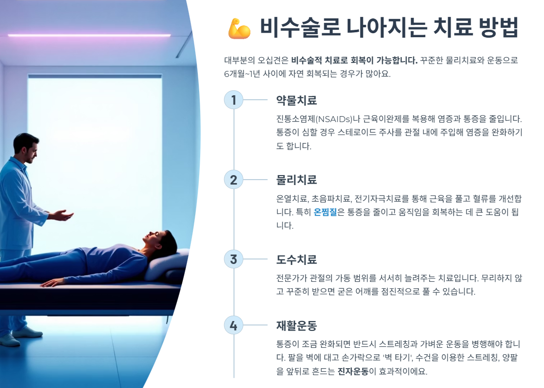 대부분의 오십견은 비수술적 치료로 회복이 가능합니다.