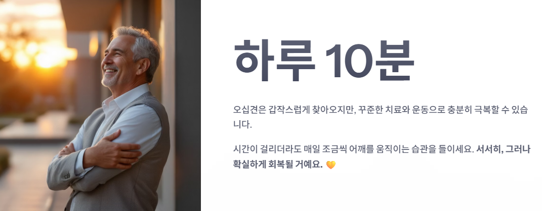오십견은 갑작스럽게 찾아오지만 꾸준한 비수술 치료와 운동으로 충분히 나아질 수 있는 질환입니다.