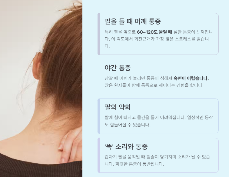 초기에는 단순 어깨통증으로 오해하기 쉽지만, 시간이 지나면 통증이 점점 심해지고
