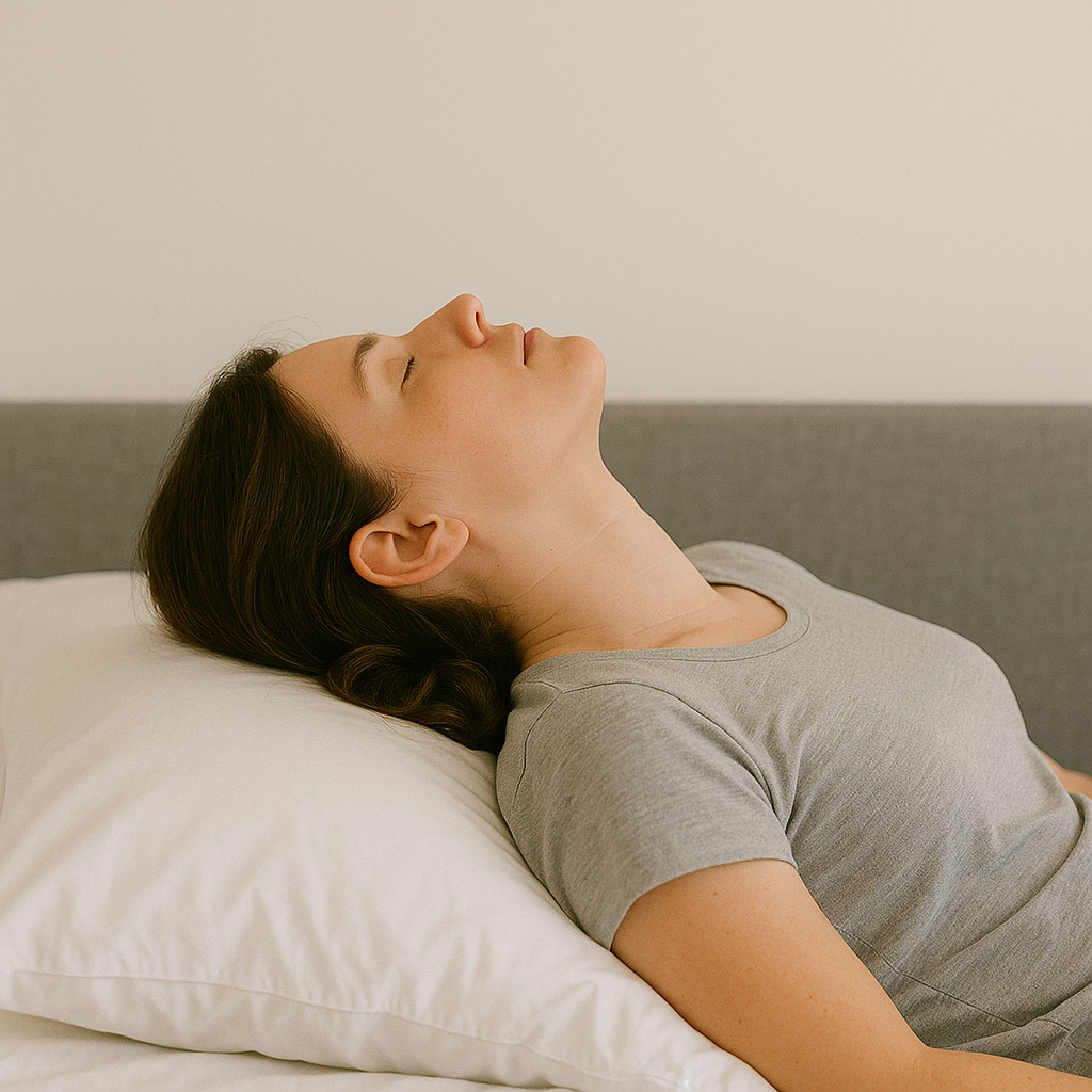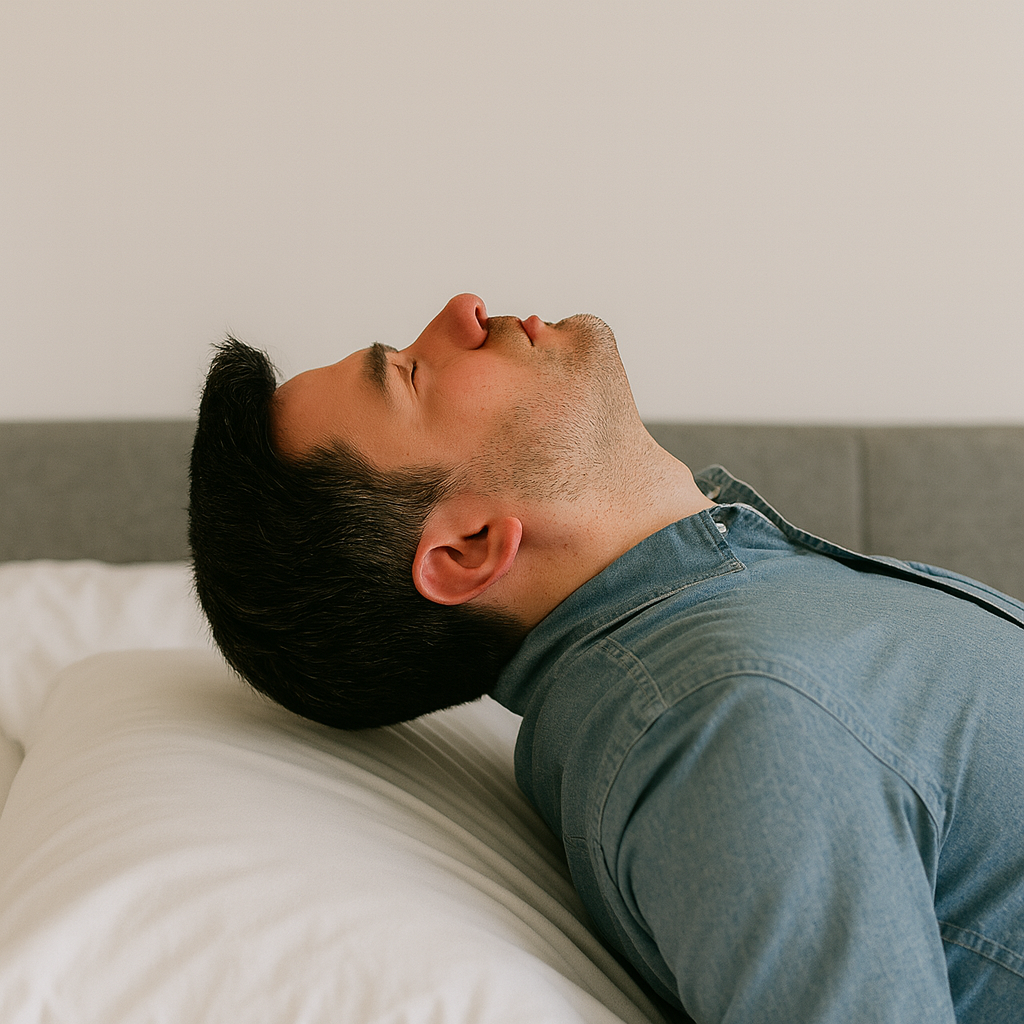 침대에 앉은 뒤 옆으로 누워 고개를 천장을 향하도록 돌린다