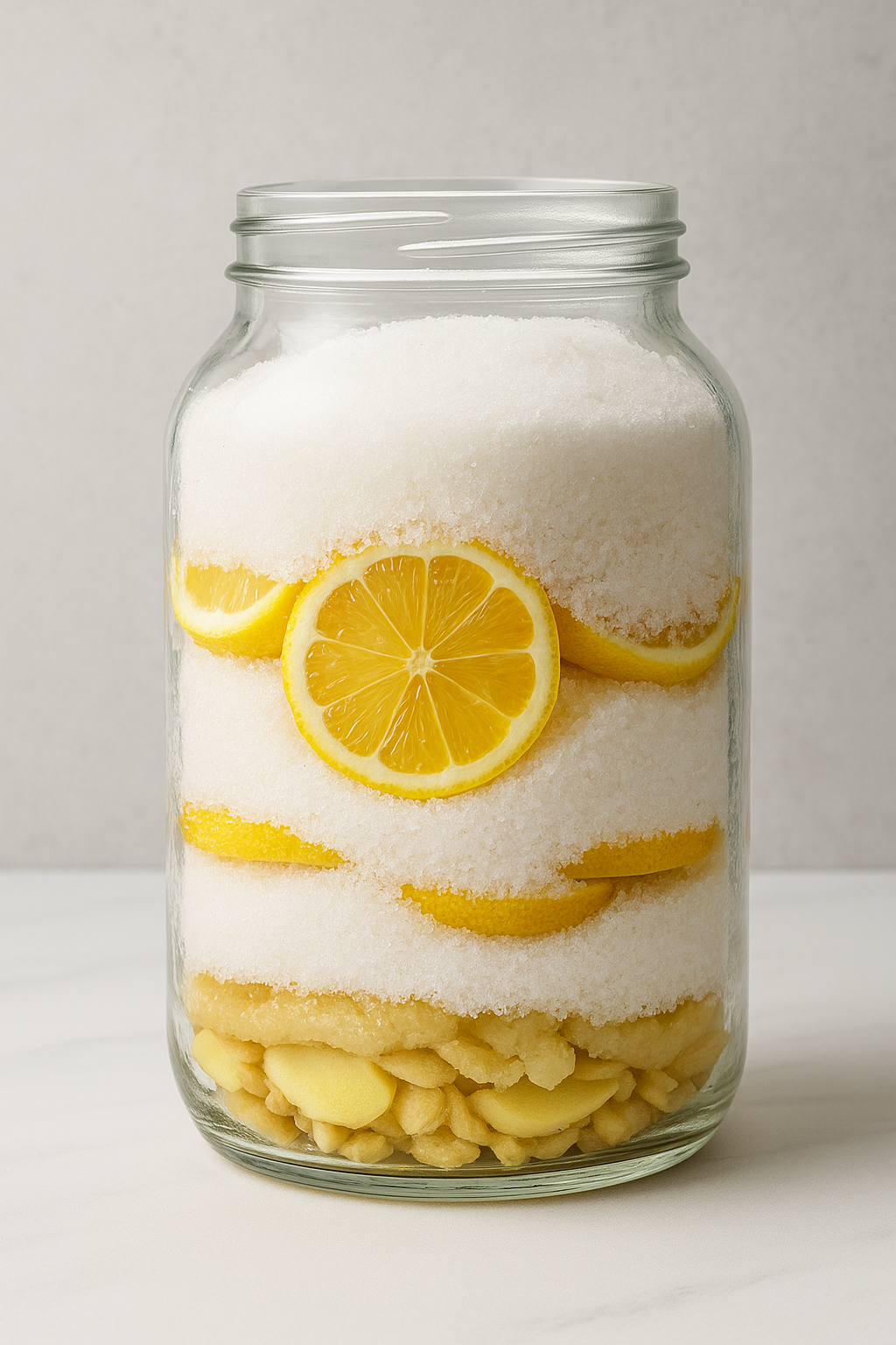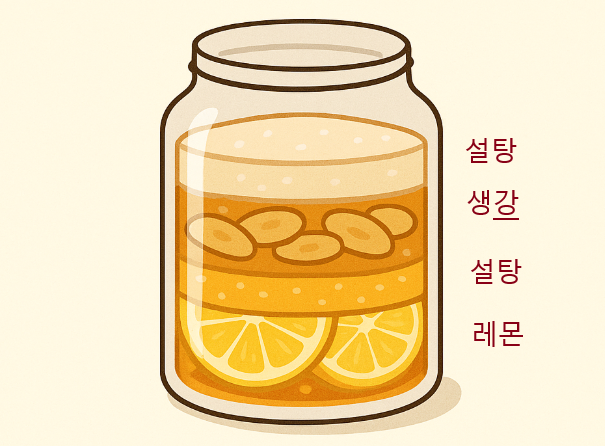 1단계: 층 쌓기레몬 → 설탕 → 생강 → 설탕 순으로 반복하며 층층이 담기. 마무리는 반드시 설탕으로 덮어 공기 차단하기.