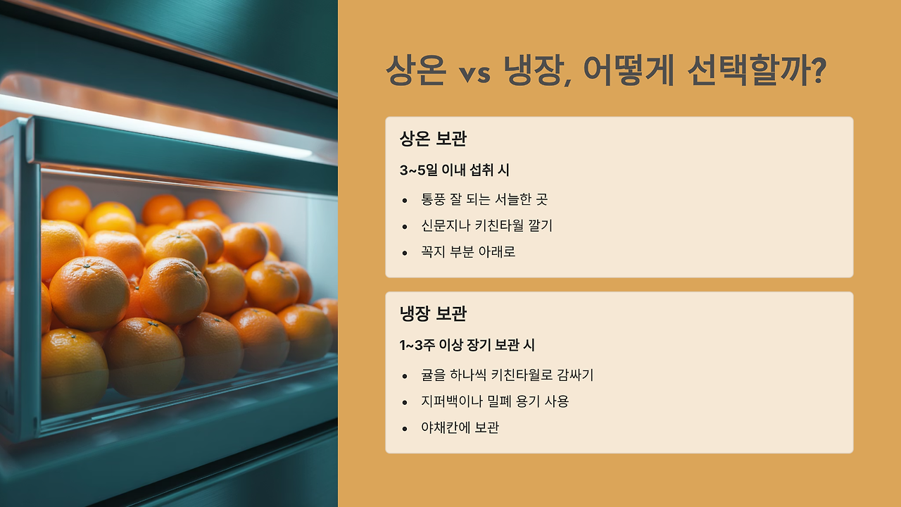 귤 보관법에서 가장 많이 헷갈리는 부분이 바로 상온 보관과 냉장 보관의 선택입니다.