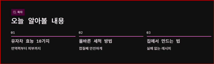 유자차 효능부터 유자 세척방법, 집에서 만드는 법, 섭취시 주의사항까지 한 번에 정리했습니다. 비타민 C가 풍부한 유자차가 감기 예방과 면역력 관리에 어떤 도움을 주는지, 껍질째 사용하는 유자를 안전하게 세척하는 방법은 무엇인지 자세히 알려드려요. 또한 설탕·꿀 비율과 숙성 팁을 포함한 집에서 만드는 유자차 레시피까지 담아, 처음 만드는 분도 실패 없이 따라 할 수 있도록 정리했습니다.