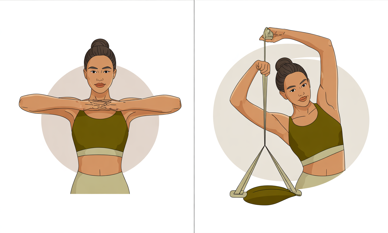 - 등 뒤에 앉거나 서서 어깨를 그대로 두고 “견갑골을 서로 모으고 아래로 내리는 느낌”으로 5초 유지 → 8~12회 반복.