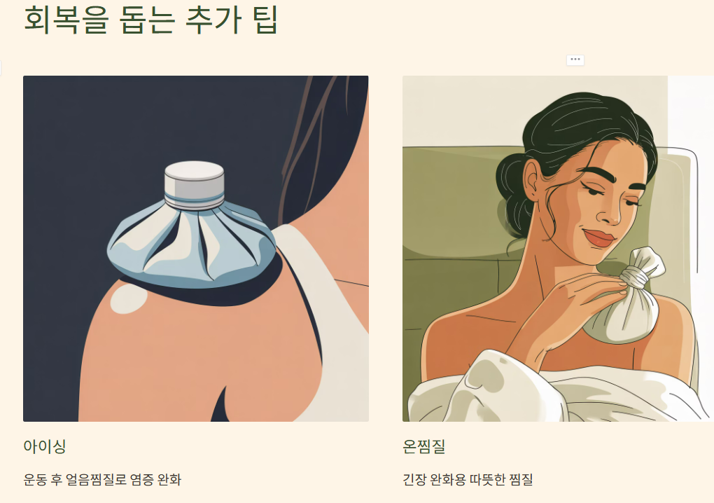 - 운동 후에는 가벼운 아이싱(얼음찜질) 또는 온찜질(긴장완화용)을 병행하면 회복 도움됩니다.