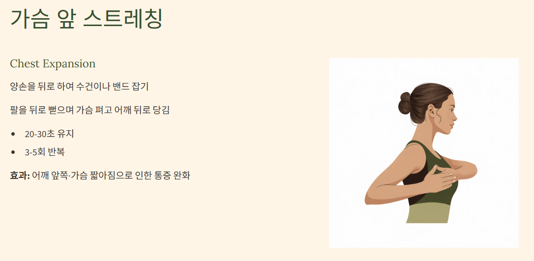 - 효과: 어깨 앞쪽, 가슴이 짧아지면서 생기는 통증이나 자세불량 완화
