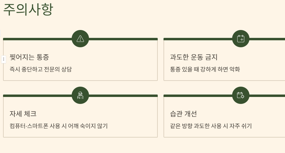 - 통증이 극심하거나 팔 힘이 급격히 빠지는 경우, 움직일 수 없을 경우엔 병원 진단 필요
